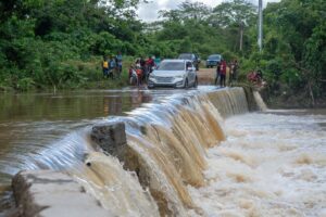 Durante la jornada, las autoridades verificaron daños significativos en infraestructuras clave, incluyendo el desbordamiento del puente sobre el río El Seibo, el puente de La Piedra en la sección La Isabelita y el puente en Dos Bocas de Arroyo Grande, situaciones que han generado incomunicación en diversas localidades.